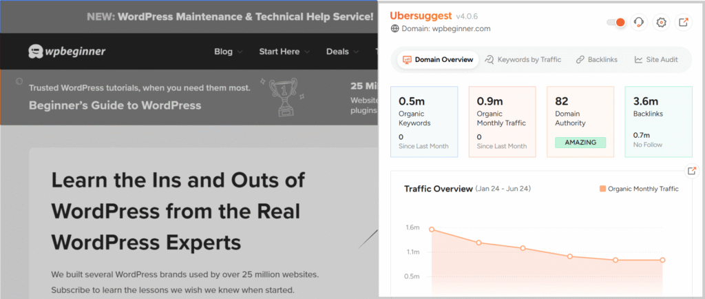 Ubersuggest is an excellent keyword research tool, and its Chrome extension doesn’t disappoint. It provides a domain overview, keyword analysis, site audits, and content ideas. You get instant access to insights that can help your keyword research and search engine optimization (SEO) efforts without leaving the webpage.