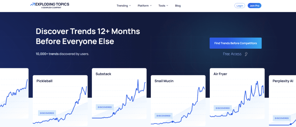 If you want to stay ahead of the curve, Exploding Topics is one of the best tools out there. It shows you what’s trending before it goes mainstream, using real-time data across industries.