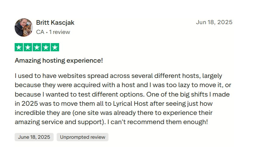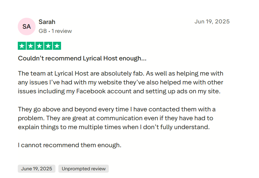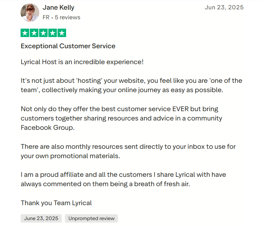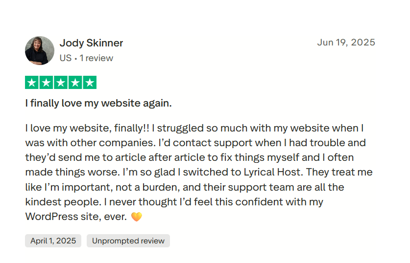 Don’t just take my word for it. Lyrical Host has an amazing 4.7-star rating on TrustPilot, with glowing reviews from happy bloggers and business owners.